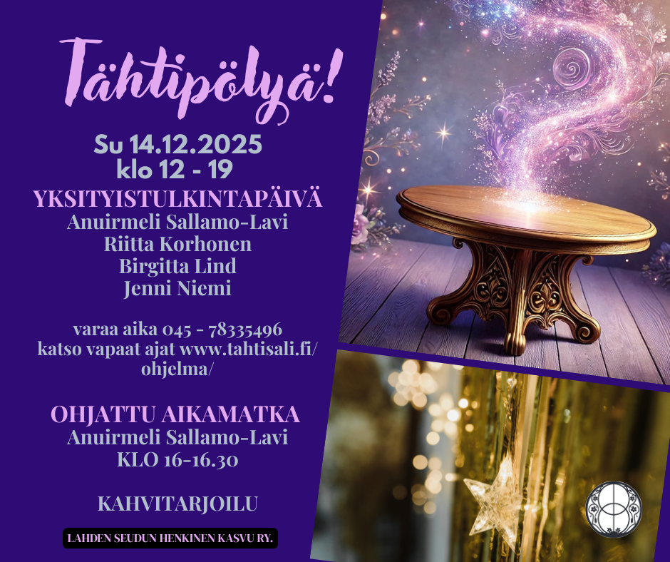 Lahden Seudun Henkinen Kasvu ry. on järjestänyt monipuolisia henkiseen kehitykseen liittyviä tapahtumia jo vuodesta 1988. Näihin kuuluvat mm. meedio- ja henkiparannustilaisuudet sekä monipuolinen kurssitarjonta. Tähtisali on tapahtumiemme keskiö ja kaikille avoin tila, jonne olet sydämellisesti tervetullut.